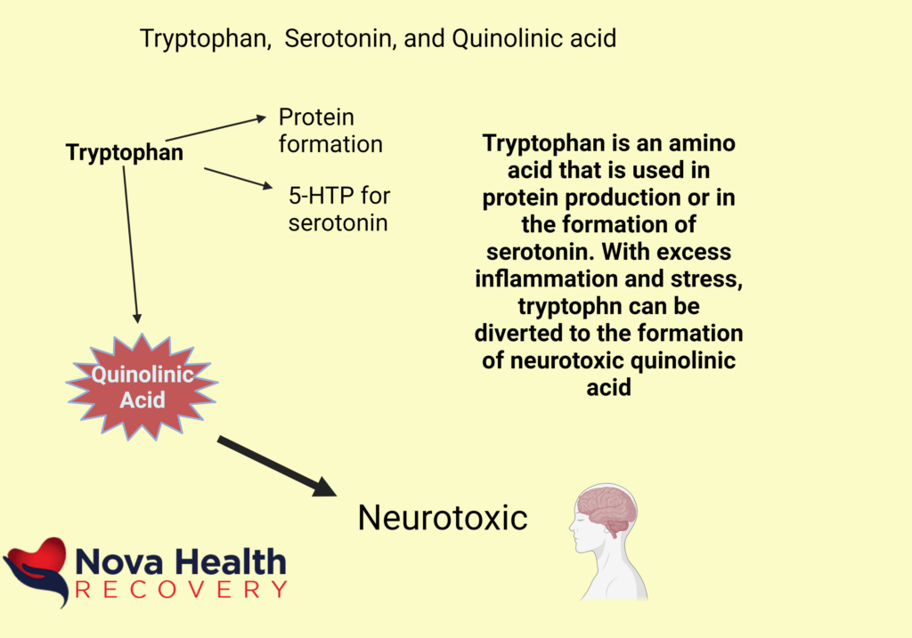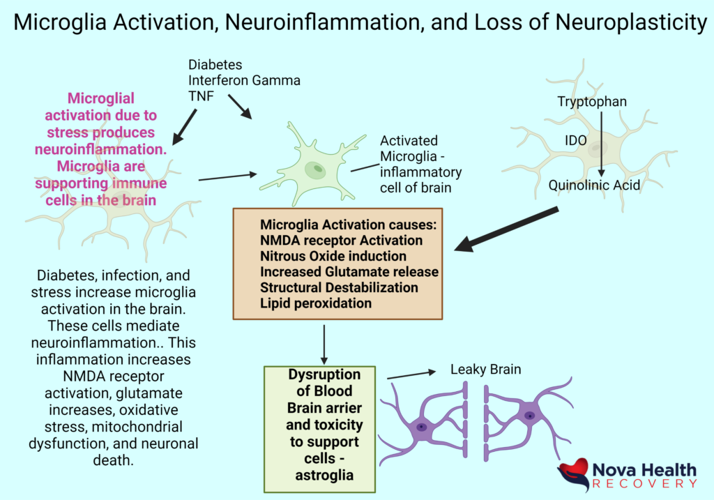Microglial activation with increased inflammation in the brain leads to increased quinolinic acid production from tryptophan, an amino acid that is used to produce serotonin. Serotonin levels drop as a result. Increased quinolinic acid results in overactivity of the NMDA receptors in the brain which then causes neuronal cell hyperexcitability and death.