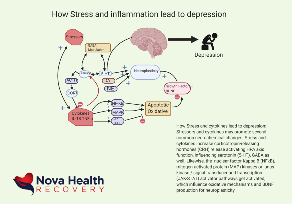 - There is inadequate monoaminergic and neurotrophic signaling in depression with excessive glutaminergic and inflammatory cytokine transmission. This causes glial-neuron breakdown, which further impacts corticolimbic processing.